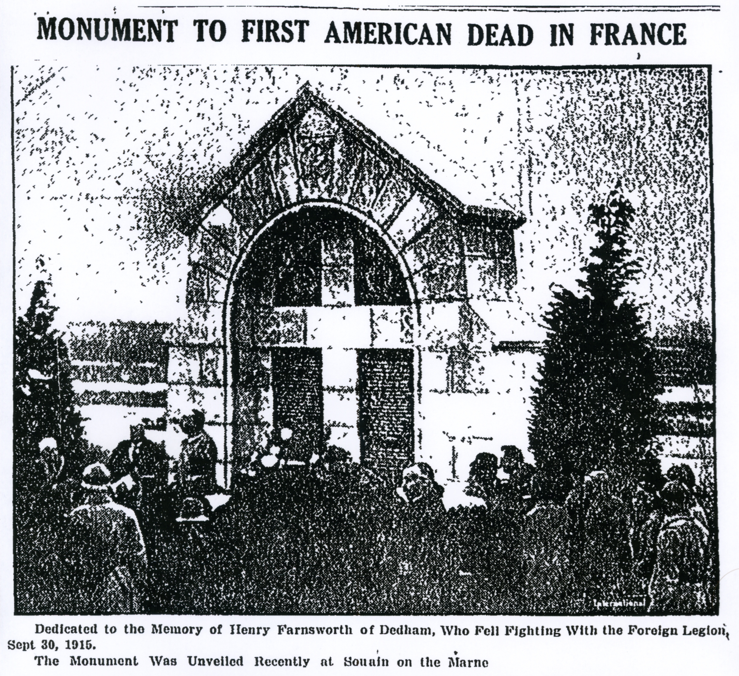 Farnsworth’s last letter home was dated September 16. On September 28, he was killed while fighting in the trenches outside of Champagne. Many of his fellow Legionnaires spoke of Henry Farnsworth’s remarkable spirit and bravery. His letters were later published by his father and can be found on Googlebooks. In 1920, an elaborate monument was dedicated to the memory of Farnsworth and 130 other foreign Legionnaires killed in the Battle of Champagne. The monument was paid for by the Farnsworth family.
