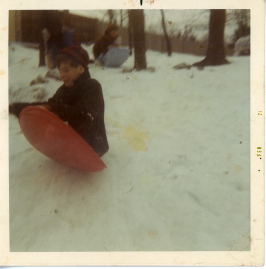 We had a small hill in the backyard and would build jumps out of snow. Those plastic coasters were the newest thing at the time. In the background, my older sister is about to go down the hill with my year and a half year old brother in his plastic bathtub.