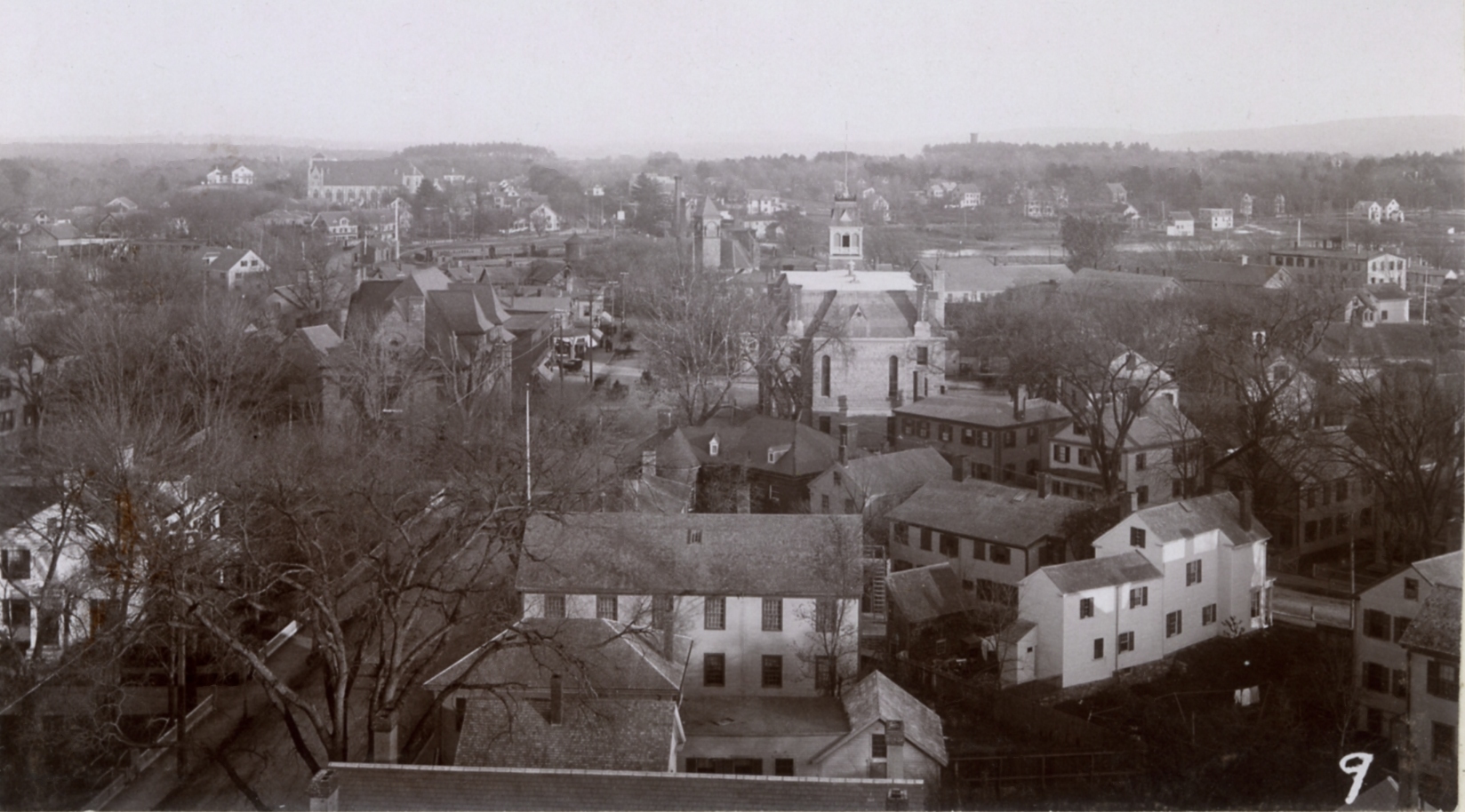 March 19, 2011This is a very cool photograph, taken from the top of the court-house on High Street, looking east. Many of the buildings in this view are long gone, such as Memorial Hall and the train station, both built of Dedham granite quarried nearby. Sticking out of the trees in the background just right of center is the water tower that stood on Walnut St. until recently.