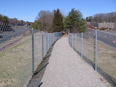 The fence runs about a thousand feet down a narrow corridor, and the land then opens up into a much wider woods. Even with the trees still bare, once you are inside the woods you don’t really see the highway; but you can certainly hear it. Check out the satellite view on Google maps (which does label it as the Dedham Town Forest). It really is a pretty big piece of land, extending all the way to Rte 109. So the next time someone tells you to “go play in traffic,” you’ll know where to go.