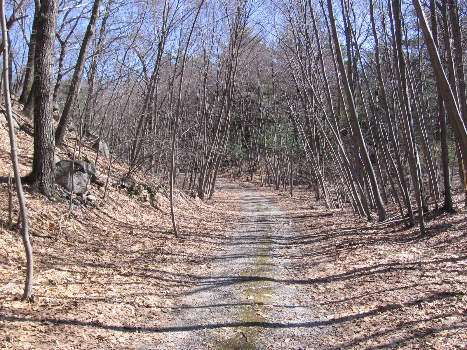 Here I am entering the town forest. Yes, that is Route 128 North to my right; the southbound lane is to my left just out of view. So that means… the town forest is on the median strip?