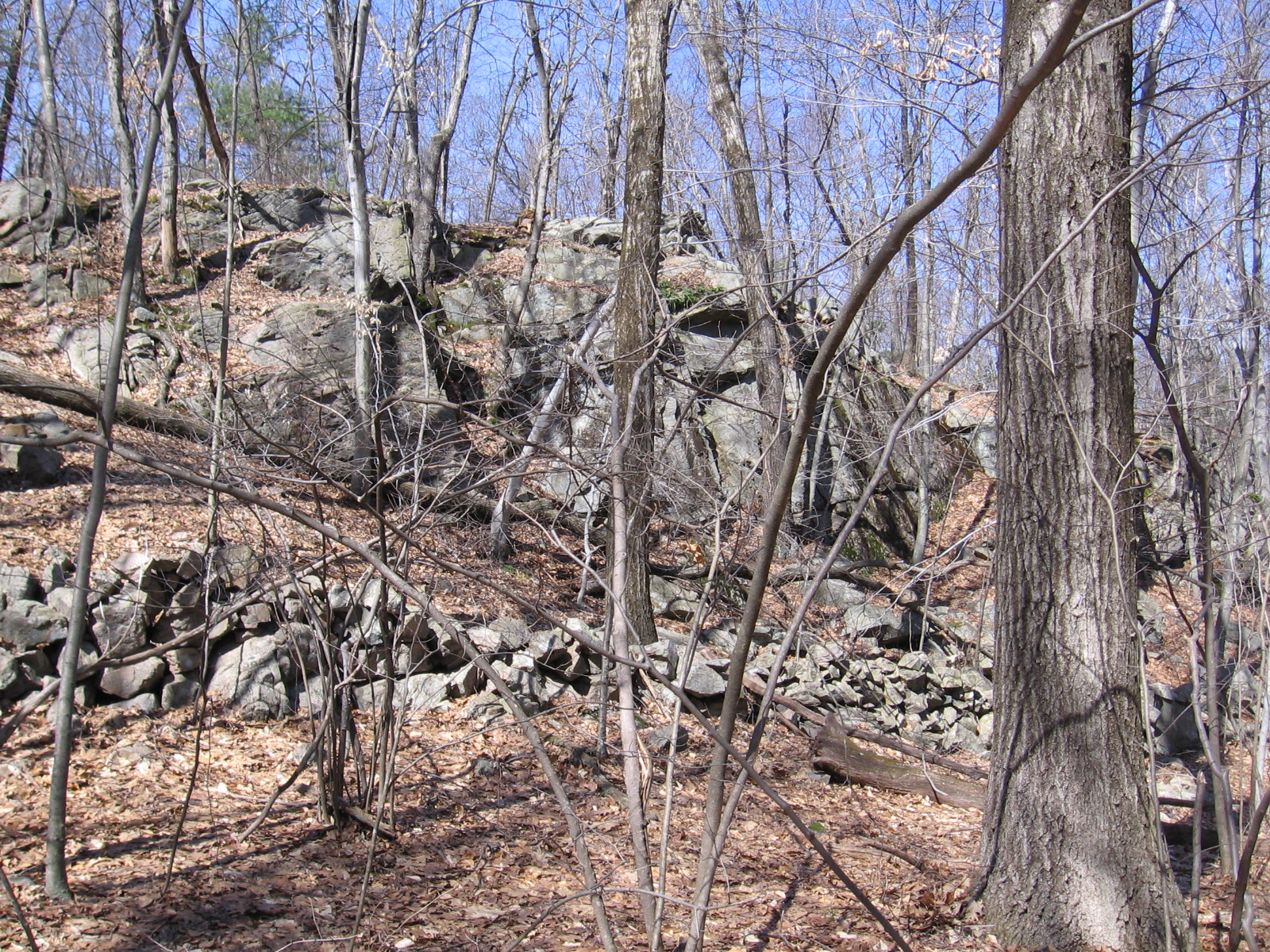 These rock formations explain why the area is referred to on old maps as “Ye Rockes.” It also explains why 128 had to be routed around the area, creating this large forested island in the middle of the highway.