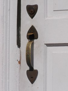 The deeply carved intersecting lines in the fireplace timbers pictured above are believed to be hex signs intended to keep both witches and fire from harming the occupants. Over the years shoes have been found in the ceilings and behind the chimney; placed there to trap evil spirits as they attempted to enter the home. Other early Dedham residents took similar measures to keep their homes and families safe. When the seventeenth century John Farrington house was renovated in the 1880’s, a spoon was found under the foundation, placed there by the builders to give the house strength. A “hex” sign can also be found on the front door latch of the Dedham Community House, built for Judge Samuel Haven.