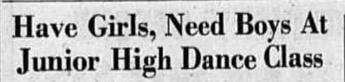 Russell Curry ran a Junior High Dance class in Dedham from the early 1950s through the 70s. The classes were held in the Oakdale School gym. According to the Transcript, Curry offered “instruction in ballroom dancing, Virginia Reel and a ‘Rock’ step, social graces, including introductions, reception lines, and general party behavior.” The boys wore suitcoats and ties, the girls wore dresses and white gloves, and upon arrival would sit on opposite sides of the gym until the dance selection was announced. Then the boys would take that long stressful walk across the floor to choose a partner. The only part of the class more stressful than this was “ladies’ choice.” At some point in the evening, the boys would take the arm of their partner and join the long receiving line to greet the evening’s chaperones, who were seated at the stage end of the gym.