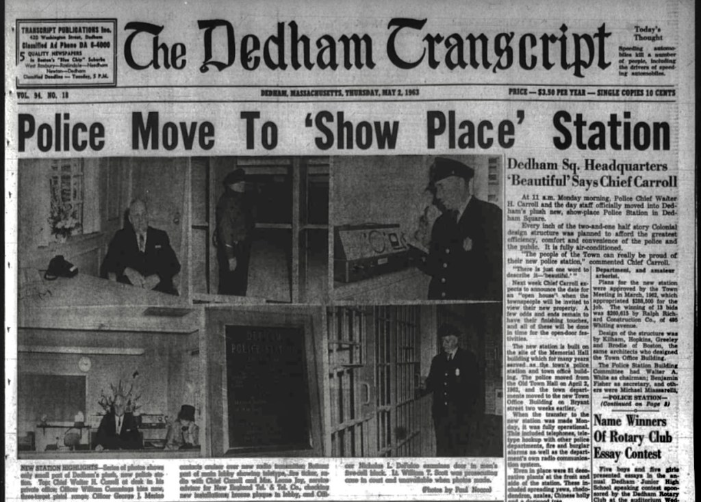 The Dedham Police Department moved into their new headquarters on April 29, 1963, almost 60 years ago. The department had been in temporary headquarters at the new town hall on Bryant Street after vacating their original home in Memorial Hall which was torn down the year before.