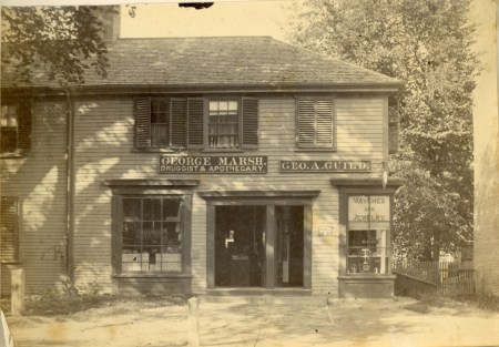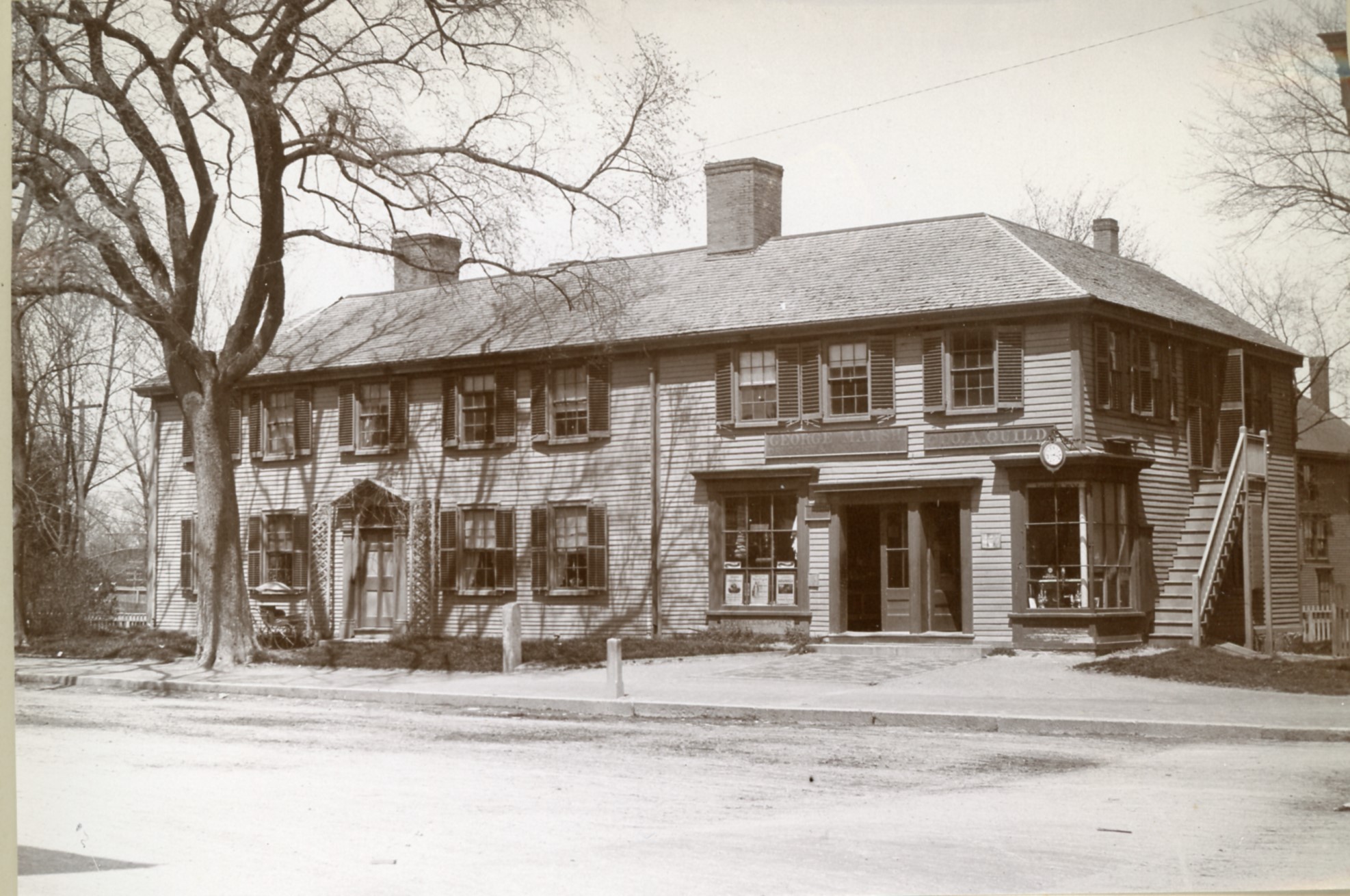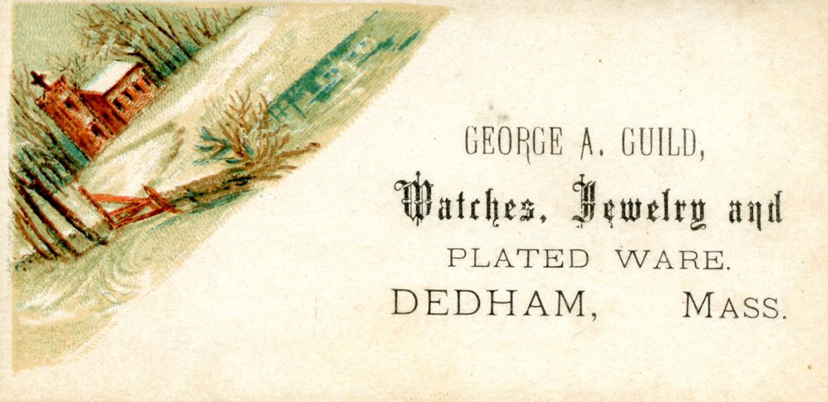 At the young age of twenty-three, Guild opened his business as a jeweler and watch seller in the old Dixon House, which stood on High Street across from Memorial Hall. The wooden watch sign that hung high above his shop window became one of the most recognizable landmarks in the Square. Guild operated at this location from 1859-1891, when he was forced to relocate to Washington Street as the Dixon building was being torn down to make way for the new Dedham Institution for Savings.