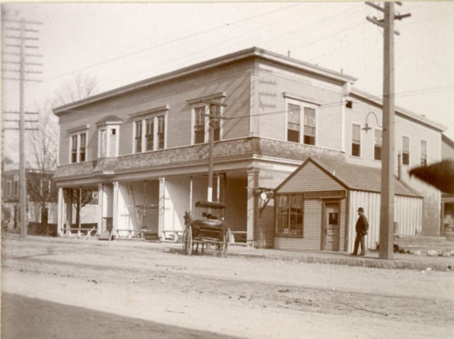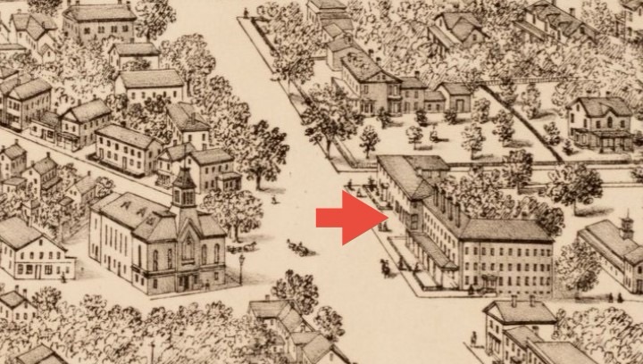 The wooden watch sign can be seen in these two photos of Guild’s shop on High StreetThe Dixon Building with George Guild’s shop as seen in this 1876 birds-eye view map by E. Whitfield. Next to it on the corner of High and Washington Streets is the Phoenix Hotel (current Knights of Columbus Building), which burned to the ground in 1880. Memorial Hall stands on the western corner of High and Washington.
