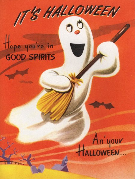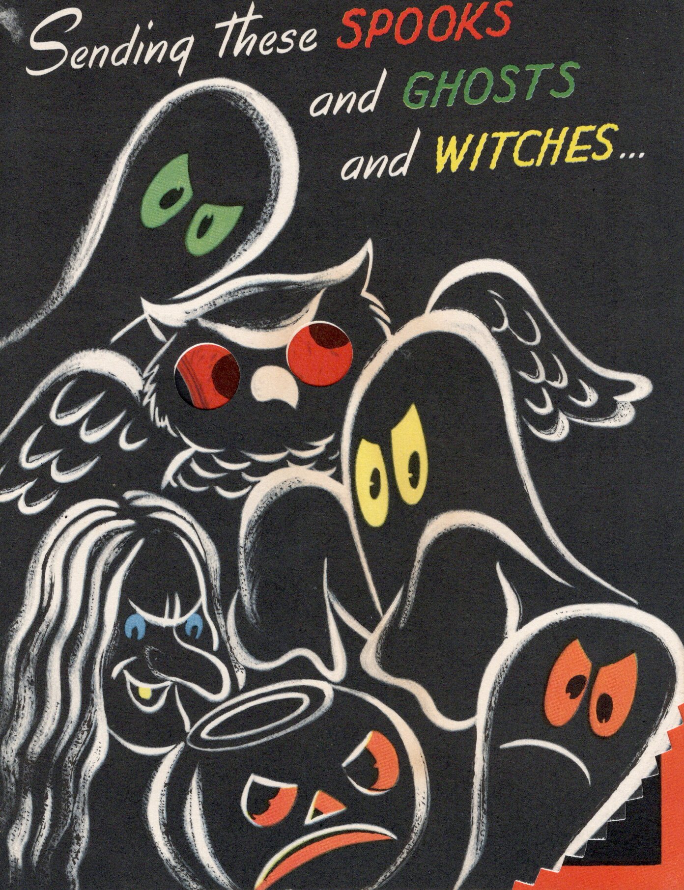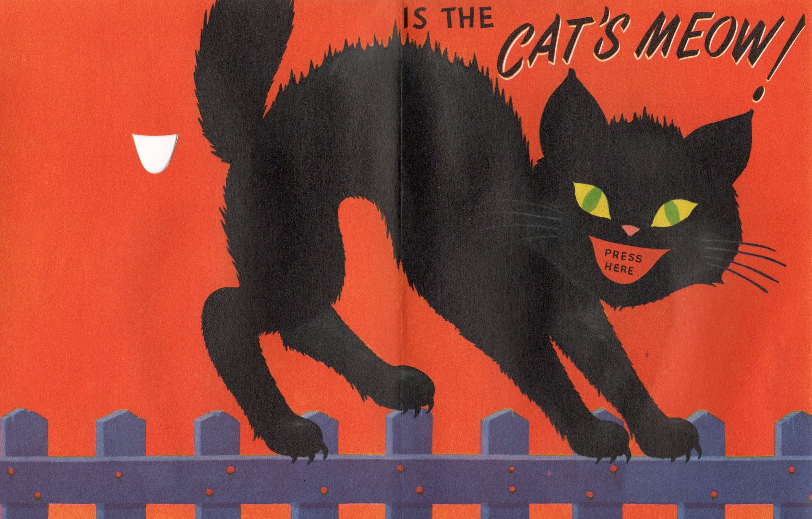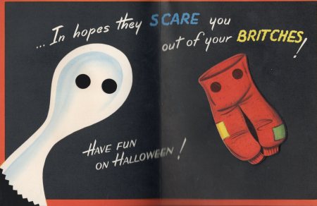 These cards were made by Rust Craft in the late 1950s. The colorful graphics and clever novelty additions (the cat in the above card made a meowing sound when you pressed it, the britches in the card below were on a spring) were characteristic of the company’s output during their early years in Dedham.