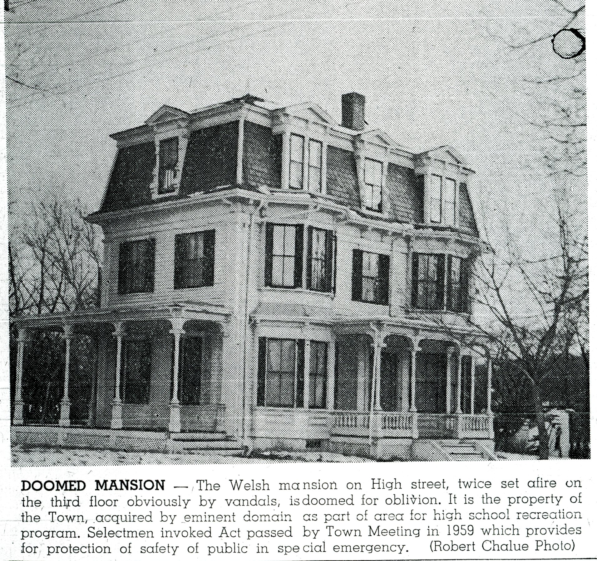 During negotiations with the town at the time of the taking, Mrs. Ella Welch, wife of youngest Welch son William, petitioned the town to save some of the “beautiful shrubbery” and the “two fine spruce trees” on the property, but town officials denied her request. Amazingly, several gnarled oak trees along High Street were spared, and today, along with the stone wall, are the only reminders of a once majestic house and the families who lived and died there.