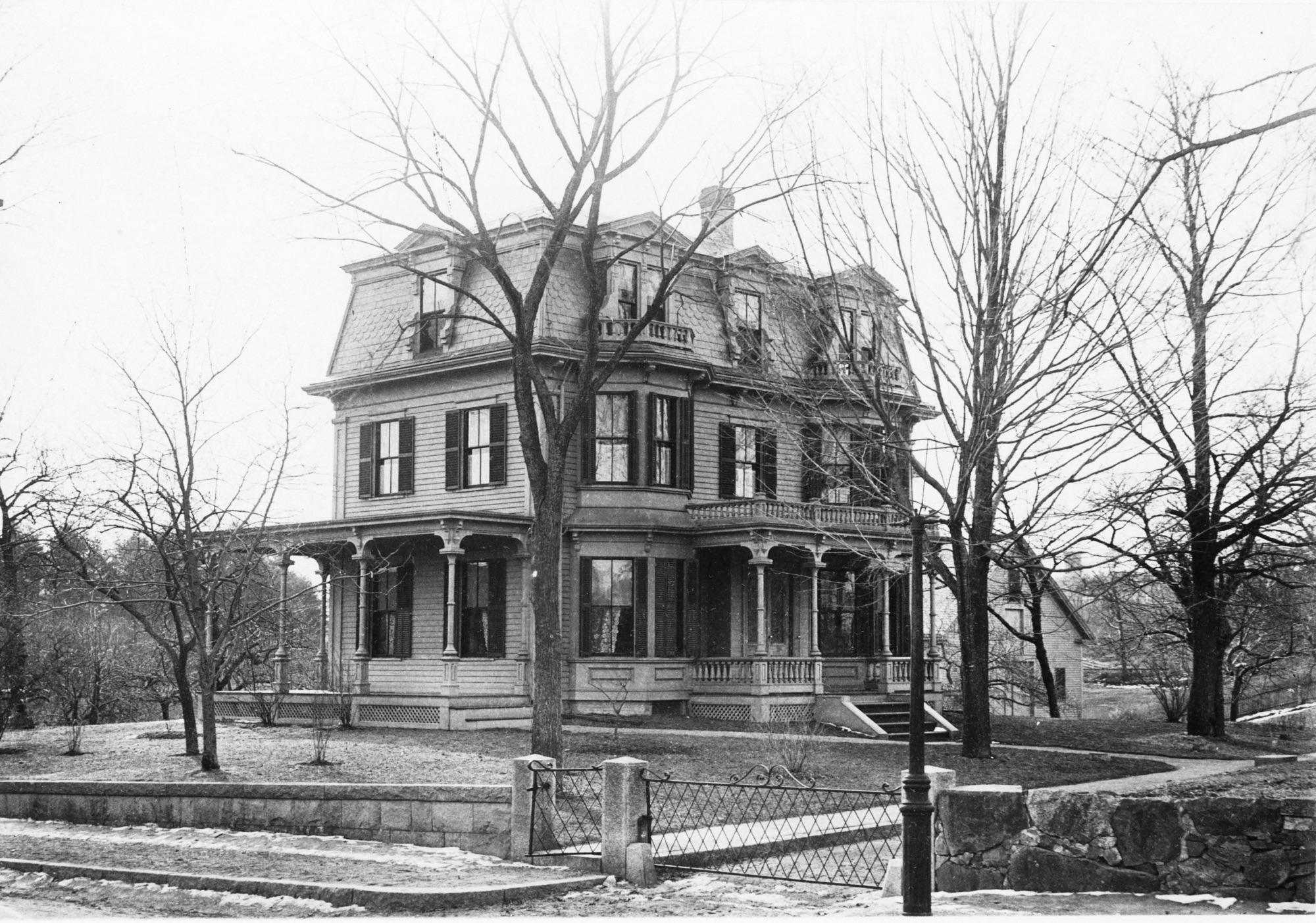 This is the third lost Dedham house featured in my Stone Secrets series, and, it is the only one that was still standing during my lifetime. Although I was only six years old when it was torn down, I do have a memory of it, perhaps because of its resemblance to the Addams Family house from a favorite TV show of the time. The Storrs/Welch house, constructed by local contractor Otis Withington c. 1870, stood south of High Street and east of Mt. Vernon, diagonally across from the Thomas Barrows estate (St. Mary’s parking lot) featured in the last Stone Series post. The large house with its Mansard roof, pedimented windows and decorative porch features is a good example of the Second Empire style, popular in the mid-to-late nineteenth century. The first occupants of the house were Royal Otis (R.O.) Storrs, his wife Lora, and three children.